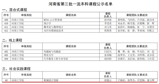 近日,河南省教育厅公示了第三批省级一流本科课程认定名单,我校申报的8门课程获得省级一流本科课程认定。其中,我部门申报的《机械设计创新》课程被认定为省级社会实践一流课程。